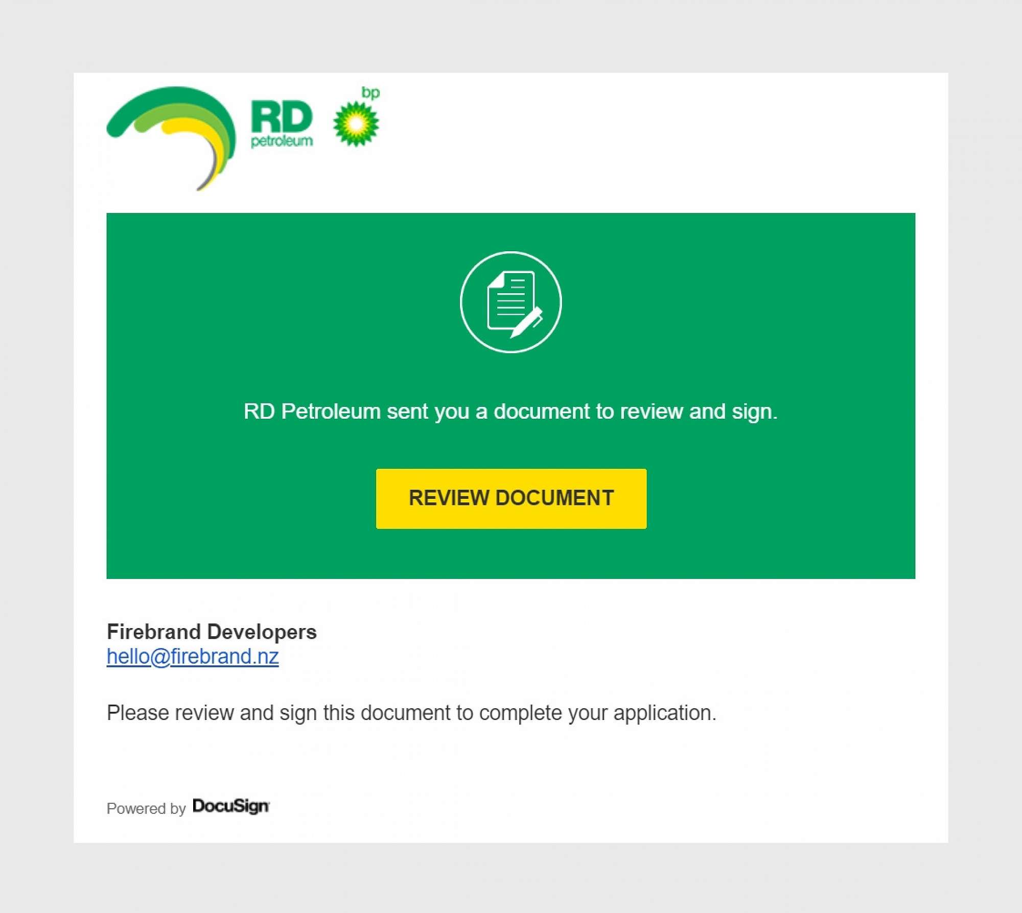 Firebrand used DocuSign to provide a secure electronic signature service. When an application form has been completed by an RD Petroleum customer, they are emailed a copy to sign electronically. RD Petroleum staff are then notified that an application is complete. The whole process is completed online from start to finish making things easy for RD Petroleum's customers and staff.