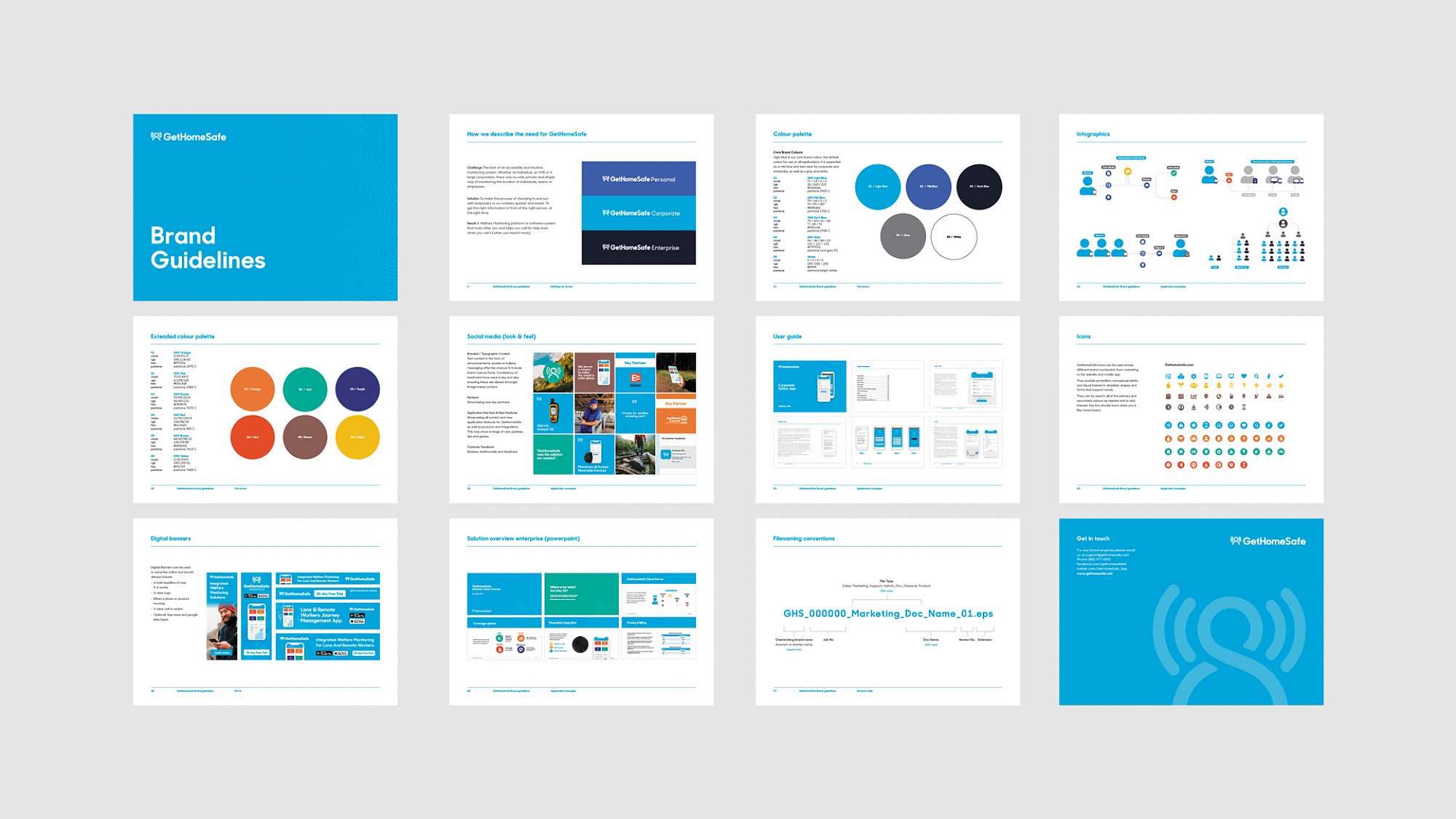 Supporting the new brand is a comprehensive set of brand guidelines for consistent use of the brand going forward as GetHomeSafe continue to grow and expand across the globe. The brand guide includes their tone, logo usage, image use, typography, brand applications and examples; and also includes UI/UX principles for the website and dashboard applications.