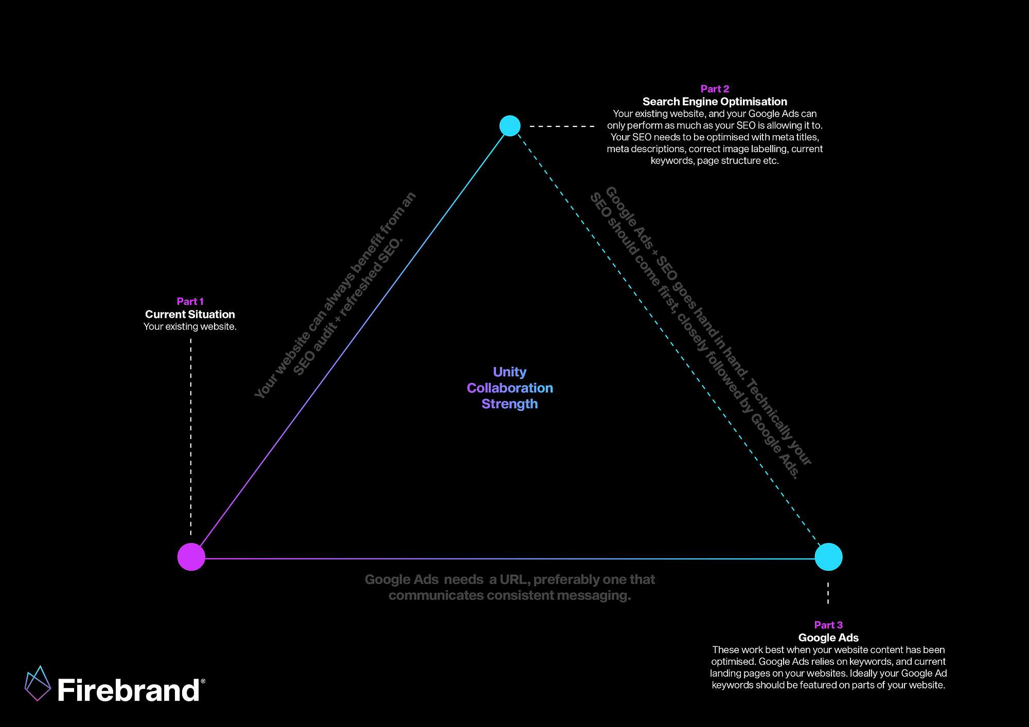 We offer Google Ad Audits, Google Ads services, SEO audits and website reviews here from the Firebrand office. Complete your triangle this year.